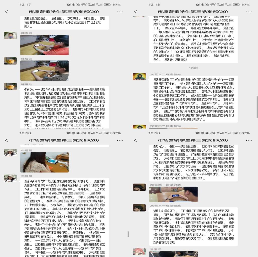 会后,全体党员在支部微信群中,交流分享了学习心得体会。大家纷纷表示,将会以此次主题教育为契机,不断加强科学知识的学习,崇尚科学精神,牢固树立“反对邪教,从我做起”思想,争取在全社会反邪教斗争中起到先锋模范带头作用。