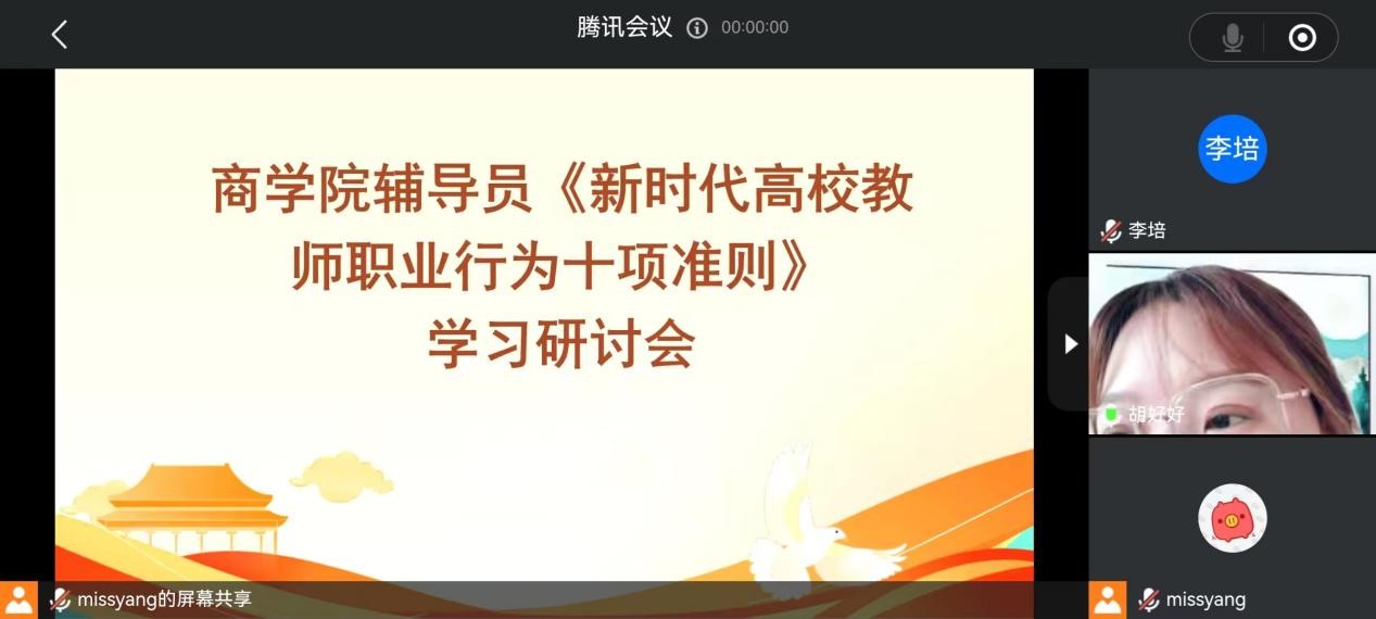 为深入学习贯彻党的二十大精神,贯彻落实习近平总书记关于教育的重要论述,打造德才兼备的教师队伍,塑造良好的师德师风形象,2023年8月19日,太阳成集团122ccvip在线上召开了学习《新时代高校教师职业行为十项准则》专题会议。会议由太阳成集团122ccvip杨慧老师主持,太阳成集团122ccvip经理白朋飞、党委书记郭峰、行政秘书郗艳花和全体辅导员老师参加。