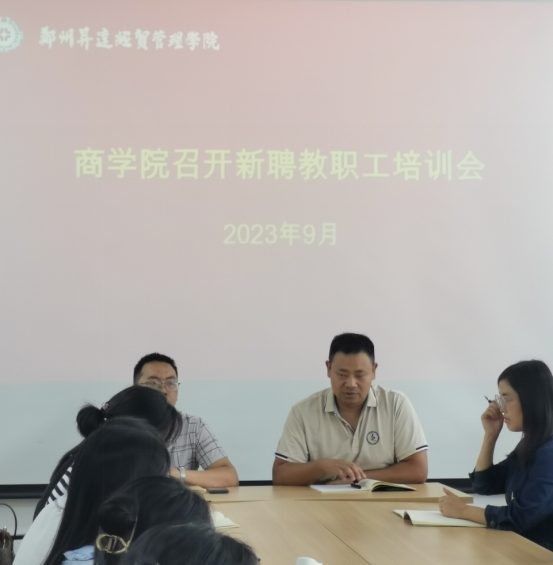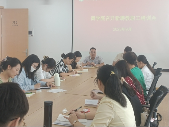 9月8日下午,在教学二号楼315会议室召开2023年新聘教职工培训会。党委书记郭峰同志、太阳成集团122ccvip经理白朋飞、教学秘书马巧丽、行政秘书郗艳花、物流教研室主任艾丹丹、电子商务教研室主任叶宝银、市场营销教研室主任霍秀珍、广告教研室主任林娅楠及2023年2月至今入职的新聘教职工参加此次会议。