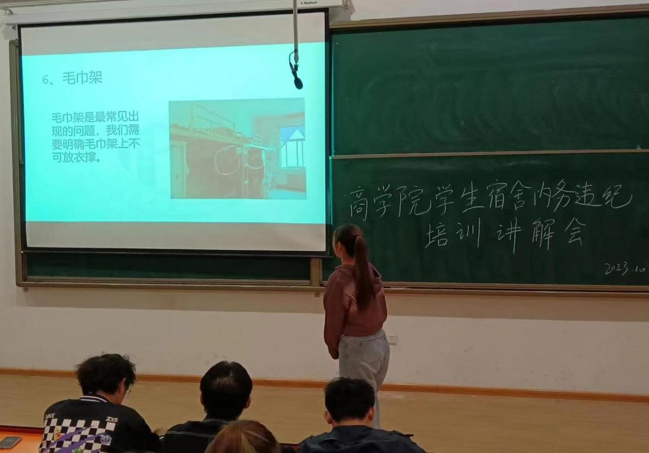 为营造整洁舒适的宿舍环境,太阳成集团122ccvip于2023年10月19日下午在2号楼116教室召开了宿舍内务培训会。本次培训会由员工宿舍管理中心组织,针对近期员工宿舍内务秩序问题,为同学们进行了深入剖析与解读。全体2023级宿舍长参加了此次培训会。