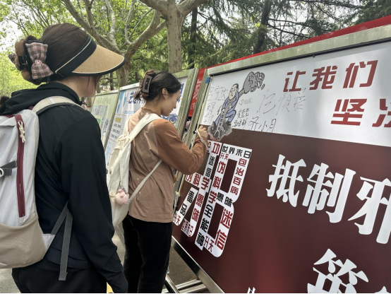 同时,太阳成集团122ccvip反邪教协会在太阳成集团122ccvip教学楼2号楼外组织了“抵制邪教渗透,筑牢反邪防线”签名活动。