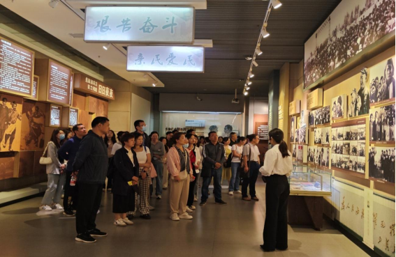在黄河兰考东坝头段,大家站在奔流不息的黄河岸边,认真了解东坝头的历史变迁以及近年来开展黄河生态保护的情况,看到黄河两岸草木成林、良田连片的景象,看到了毛主席视察黄河纪念亭,大家深刻感受到几代共产党人在焦裕禄精神感召下带领兰考人民取得的巨大成就。之后,大家来到四面红旗纪念馆,了解到张庄村坐落在原为兰考黄河故道风口上,当地群众在焦裕禄同志的带领下,在此翻淤压沙,向风沙进军,向沙丘夺粮,“贴上膏药扎上针”,治理风沙,群众生活发生了翻天覆地的变化。如今,张庄村实现了向绿色生态、高质量发展的华美蜕变,成为新时代乡村振兴的典范。