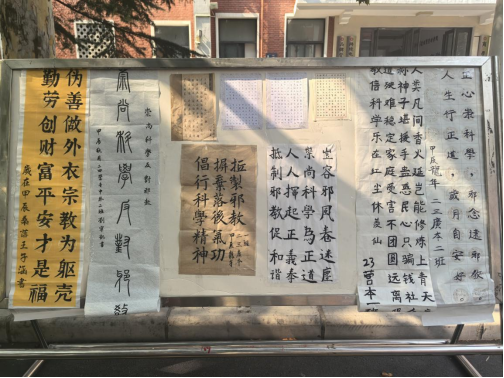 积极开展反邪教书法作品征集活动。自征集活动通知发布以来,员工们积极准备、踊跃参与,经过认真评选,共选出12幅优秀书法作品,并于10月14日举办反邪教书法作品展,在教学楼2号楼门口将优秀书法作品进行展示。本次活动使员工将反邪教意识融入到日常学习生活的点点滴滴中。举办反邪教书法作品展,以员工喜闻乐见的方式推进反邪教宣传工作,传播反邪教信息,提高公众防邪反邪能力。