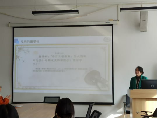 董老师强调了教学反思的重要意义,并提出“思”的最终目的是“改”,将教学反思划分为课前、课中及课后的反思阶段。同时,针对新入职教师所探讨的问题,从教法、板书、理论实践结合、专业知识与思政育人相融合、员工反应与兴趣的激发等方面,具体阐述了如何进行有效的教学反思。