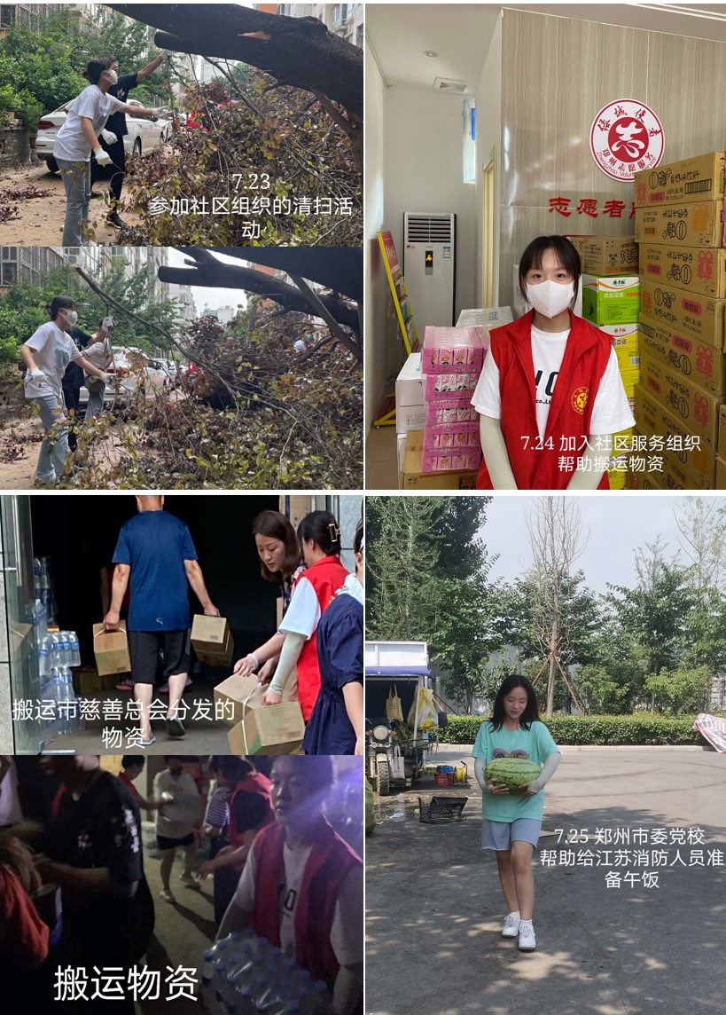 2019级电子商务本科1班,河南的暴雨让数万人猝不及防,7月23日,加入了社区的清扫组,处理挡路,歪倒的危险树木,朱祎婷为居民的的日常出行减少风险。7月24日,加入郑州市“绿城使者”志愿服务团队,从下午3时至晚10时,搬运慈善总会分发的救灾物资。7月25日,听从组织安排,前往中共郑州市委党校加入志愿活动,为来自江苏的消防官兵准备午饭、晚饭。朱祎婷同学表示:通过几天的志愿活动 深刻感受到了“团结就是力量”这句话,一件件物资让我感受到了全国人民的关爱,真真切切感受到了我们中国人民的力量,看到消防员和兵哥哥们在休息室里熟睡,真的很心疼!很幸运我生长在这样一个美好的中国,中国加油!河南加油!