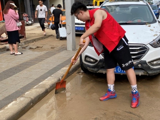2018级营本1班的乔禛临,身在郑州,为了能让环境改善,加入志愿者团队,于2021年7月22日参加中原区陇海路金水河附近淤泥清理工作,为郑州市的城市卫生尽一份。乔禛临说:我们的城市受到汛情影响,环境不再整洁,要守护家园,就从在自身做起。