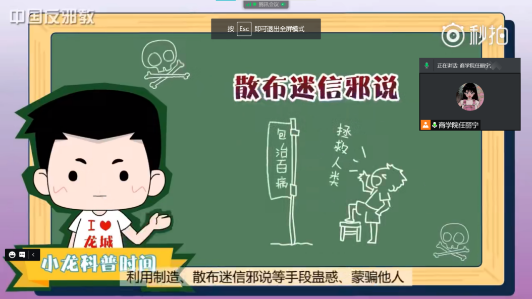 接下来,通过生动的科普视频,警示同学们注意邪教组织对社会产生的严重后果。同学们进一步认识到邪教是如何蛊惑人心、催害社会的,并就邪教的危害和真实事件展开讨论,发表如何发现邪教、抵制邪教的看法。