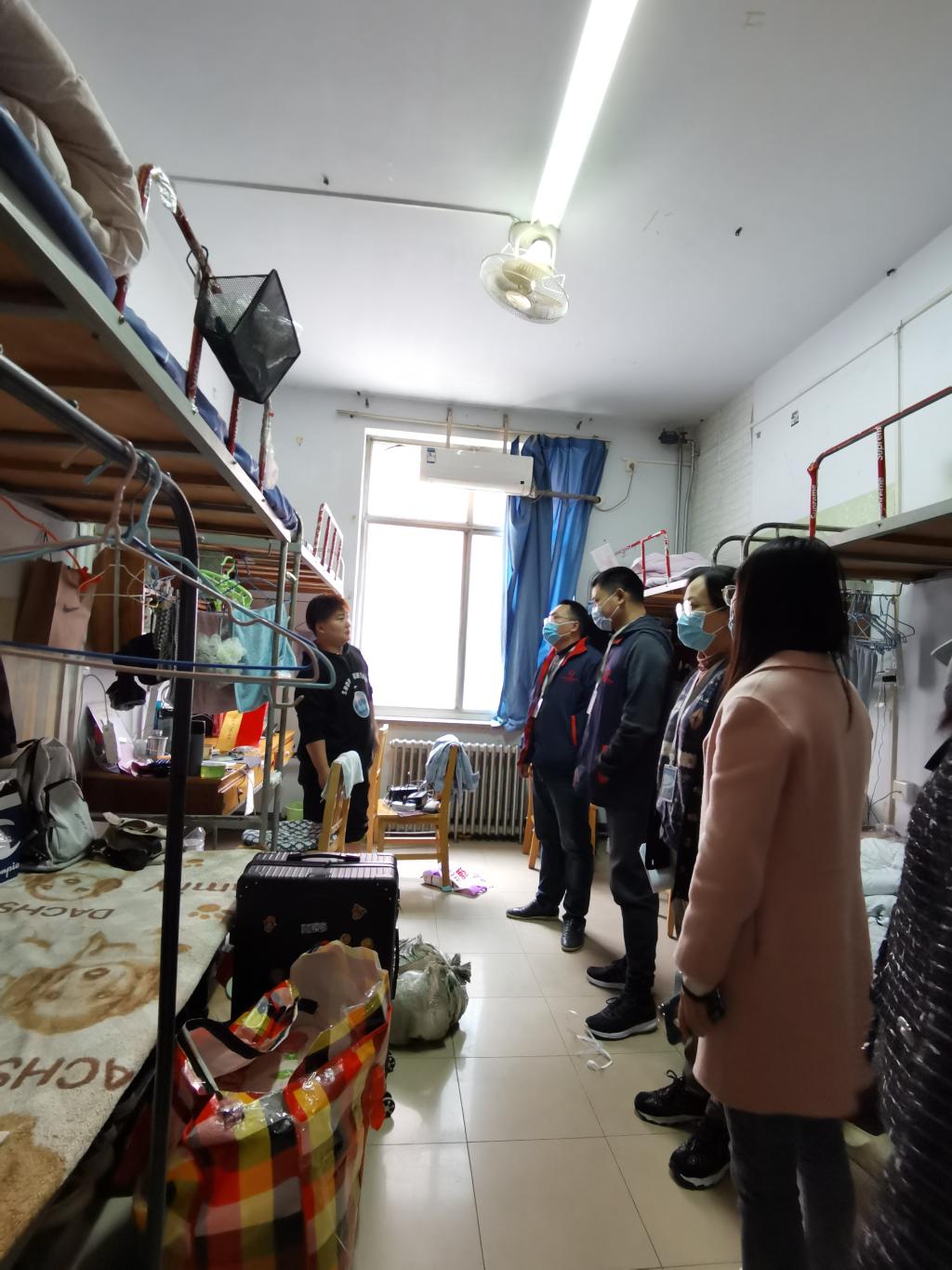 各位领导、老师逐一走访了员工宿舍,亲切与返校的员工问候交流,查看了员工的寝室卫生环境,排查了宿舍安全隐患,叮嘱同学们及时领取课本,按时上课。郭峰书记、白朋飞副经理仔细询问了同学们返校后的生活情况,并围绕专业学习、校园文化活动、生活饮食等各方面与同学们谈话交流。行政秘书郗艳花老师,教学秘书马巧丽老师对员工宿舍安全、卫生等方面逐一检查,叮嘱员工要严格遵守学校宿舍要求,禁止使用大功率电器,提升安全意识,继续开展“美洁家园”活动,保持学习生活场所的环境整洁。走访中,学院领导嘱咐同学们要高度重视疫情防控,遵守学校各项疫情防控措施要求,注意保持宿舍卫生环境,戴口罩、勤洗手、常通风,认真做好宿舍清洁卫生,强调在防控上认真执行“非必要不离校”,不松懈、不麻痹,再接再厉。