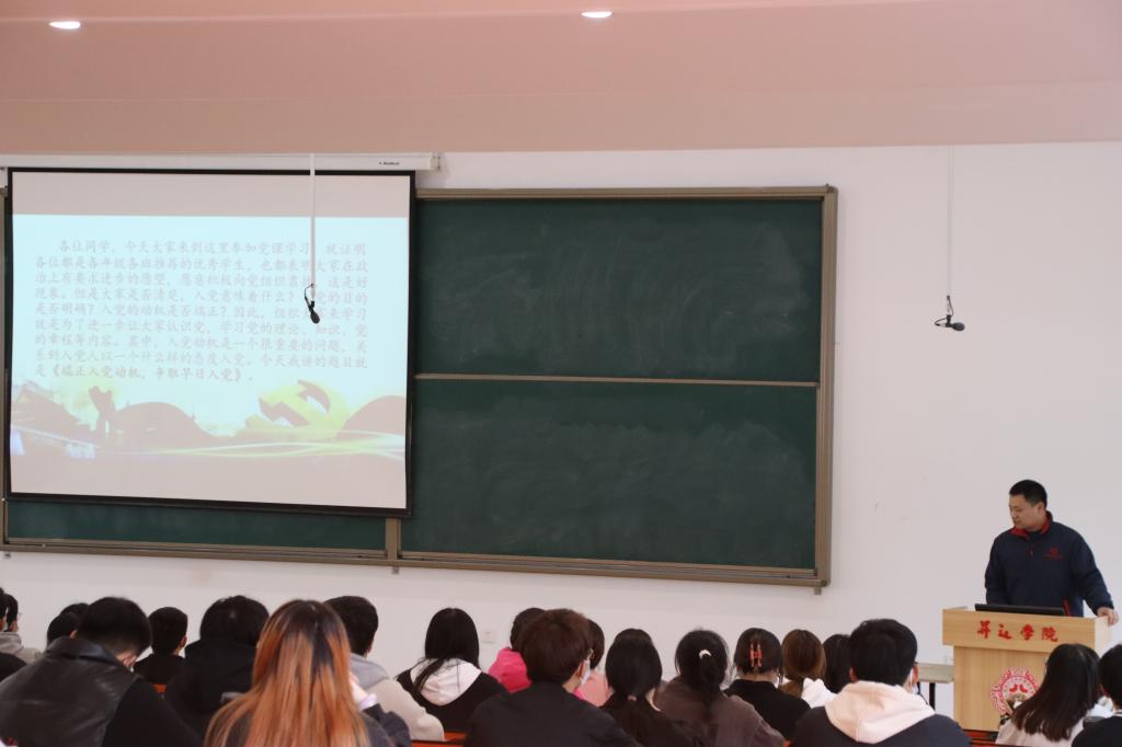首先,郭峰同志向参加党课培训的同学表示欢迎,并提出几点要求,希望参与党课培训的同学能够端正上课态度,严守党课纪律,认真对待党课培训,积极向党组织靠拢。随后,郭峰同志向在场的同学发出“入党意味着什么?入党的目的是否明确?入党的动机是否端正?”三个疑问,进而引出端正入党动机,认识党员标准,明确入党含义等讲课主题。其次,在讲课过程中,郭峰同志既结合身边的员工经历,讲述员工时期的入党不成熟思想状态,同时也引用时代热点,呼吁同学们在组织上入党的同时,也要思想上入党,最后,郭峰同志寄语参与党课培训的同学:希望能够通过自身努力,争取早日加入中国共产党。