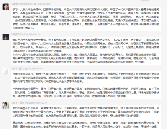 勿忘昨天的苦难辉煌,无愧今天的使命担当,不负明天的伟大梦想。会议开展了理论学习、研讨交流及学习心得分享活动。各党员同志通过学习十九届六中全会精神,纷纷发表自己的学习心得:“作为新时代新征程中的青年,我们要领悟好全会精神,并以此为指引,开创未来,埋头苦干、勇毅前行。为实现第二个百年奋斗目标、实现中华民族伟大复兴的中国梦而不懈奋斗。”“中国共产党自成立以来,始终把为中国人民谋幸福、为中华民族谋复兴作为自己的初心使命。党的百年光辉历程和伟大成就,彰显了一代代中国共产党人奋勇争先的蓬勃朝气、不懈奋斗的昂扬斗志,汇聚了攻坚克难、奋力前行的强大精神力量。”“有党的坚强领导,就没有克服不了的困难,就没有迈不过去的沟坎,就没有成就不了的宏图大业。”……一句句真挚的话语凝聚了对党的忠诚,彰显出支部党员的青春力量。