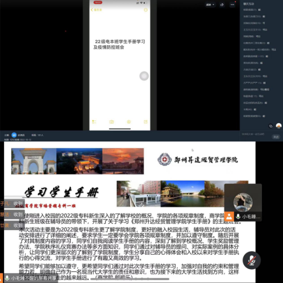 本次各新生班的学习《员工手册》线上主题班会由辅导员老师主持。会上,辅导员老师们首先强调,《员工手册》是员工学习、生活、行为规范等方面的指导性文件,是学校对员工进行管理的依据,涉及到员工在校期间的学习生活、言行处事等方方面面。《员工手册》的学习效果,关系到员工能否顺利度过老员工活,更关系到学校的校风、学风是否健康和谐地发展。