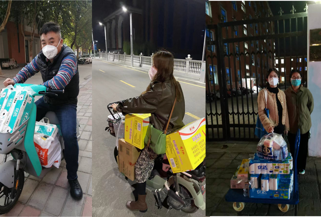为确保这些物品能第一时间送到,各位辅导员老师购买完后,在做完核酸或发放三餐空隙中挤出时间为同学们配送。辅导员老师们或推着三轮车或骑着电动车行驶在路上,将物资送到同学们的楼下。