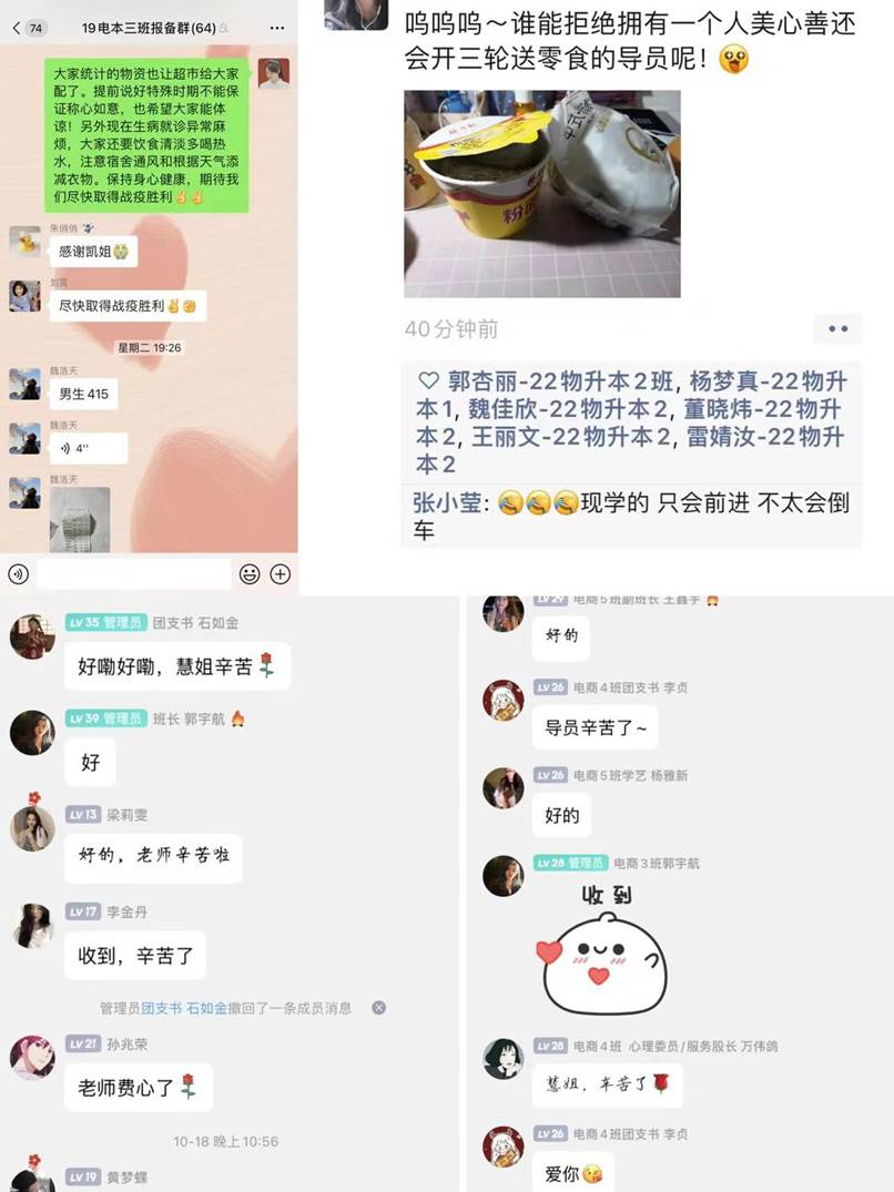 为了保障同学们的日常生活和安全,辅导员老师们已经连续多日超负荷运转,经常晚上12点多还在开会沟通工作,平时加班加点都忘了吃热乎的饭菜。但当同学们拿到物资后一条条开心的朋友圈表白,一条条短信关心和答谢,就是我们辅导员老师冲锋在前的动力!让我们“疫”路暖相随,共克时艰!