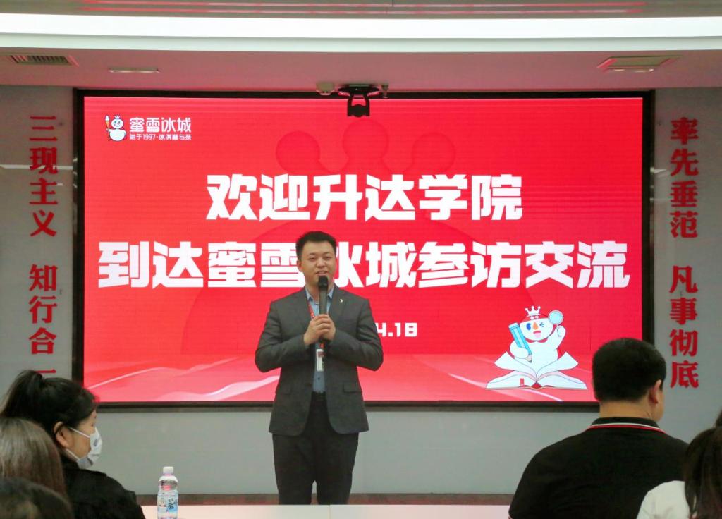 蜜雪集团战略与组织发展部经理何宗翰、蜜雪公益基金负责人杨宇给同学们热情介绍蜜雪冰城企业商业模式和蜜雪冰城公益项目,以及企业供应链相关运营知识分享,给同学们留下深刻印象。