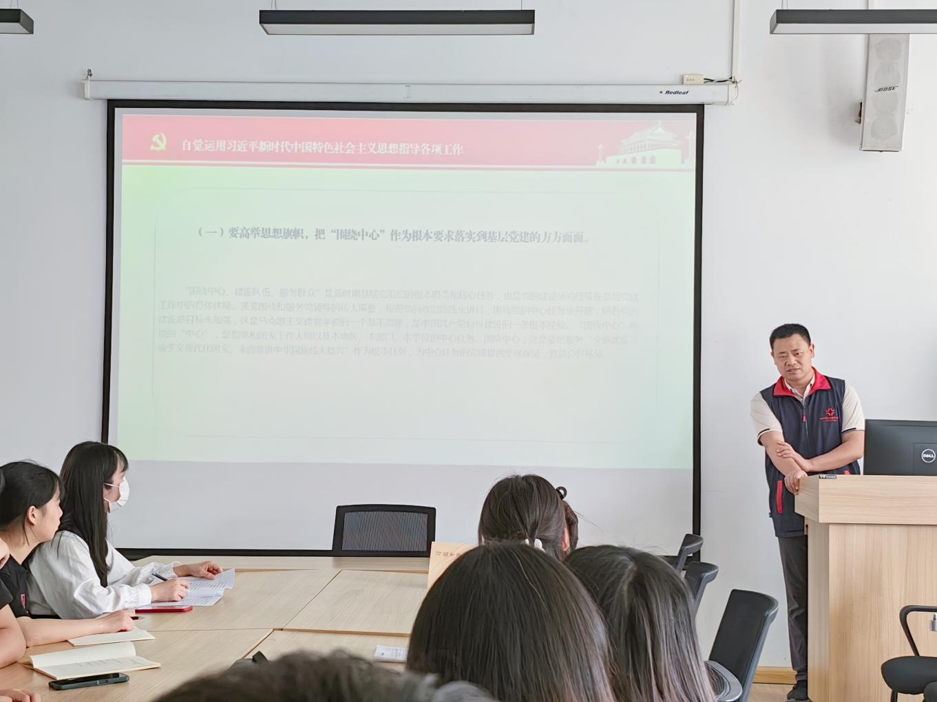 党课上,郭峰书记首先带领大家深刻领会了习近平新时代中国特色社会主义思想的精髓要义,强调每位党员要做到高举思想旗帜,将其落实到基层党建工作中,要认识到“队伍建设”是不断夯实基层基础的重要保证,要牢牢站稳人民立场,做到真正服务群众,围绕服务群众建设队伍。