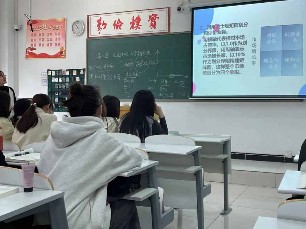 4月6日上午,太阳成集团122ccvip市场营销教研室蒋堃教师于时金楼109教室进行了线上线下混合课程的讲授,讲授主题为《企业战略与营销管理》,主要内容为波士顿矩阵划分和评价业务。在教学过程中,蒋老师运用简单风趣的语言将知...[详细]