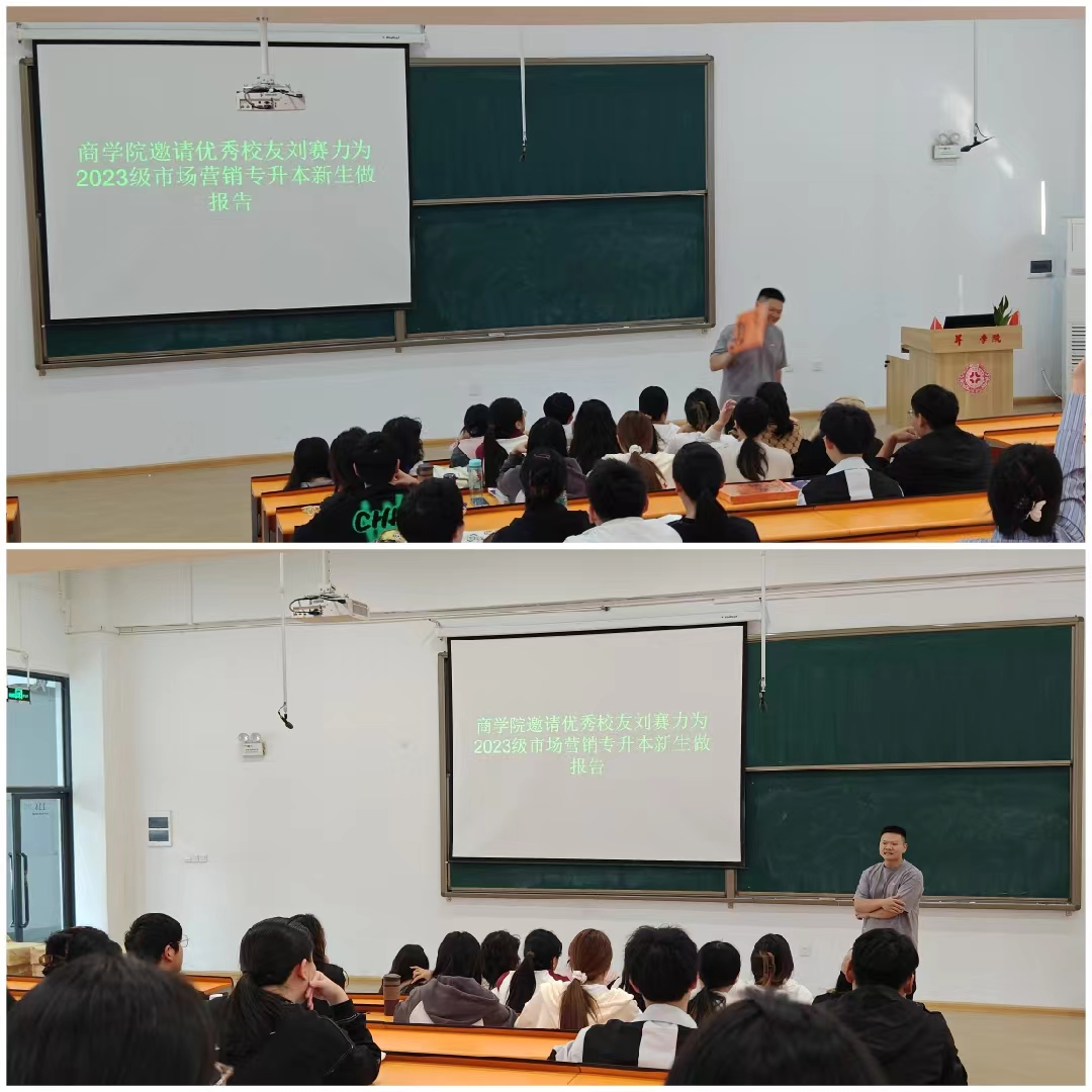 太阳成集团122ccvip邀请优秀员工刘赛力为23级市场营销专升本新生作报告