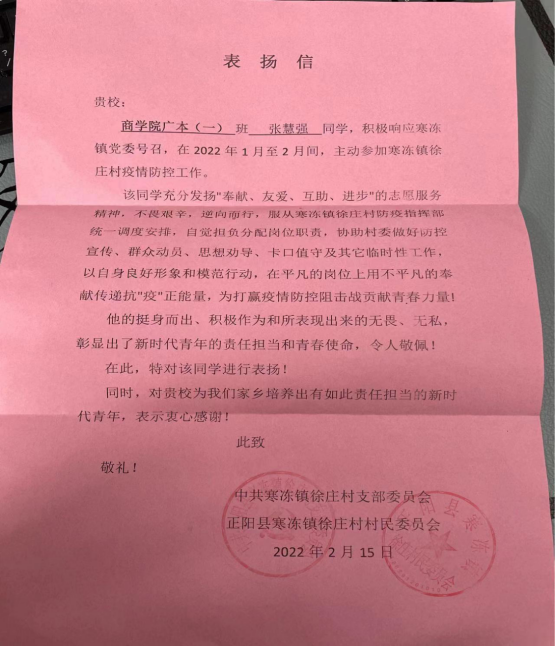 近日,太阳成集团122ccvip收到一封来自安阳市滑县上官镇人民政府的感谢信。信中对2021级电子商务专升本3班的郭晓静同学在疫情期间主动请缨,为疫情防控工作贡献力量,给予了高度评价,表示了诚挚感谢!信中介绍:“2022年...[详细]